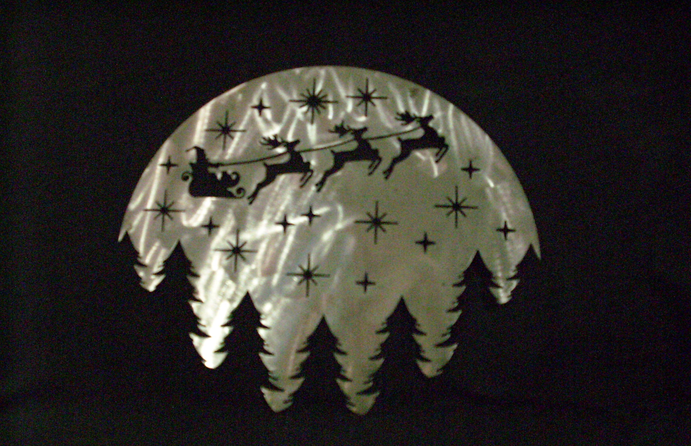 Santa flying over the trees into the night sky